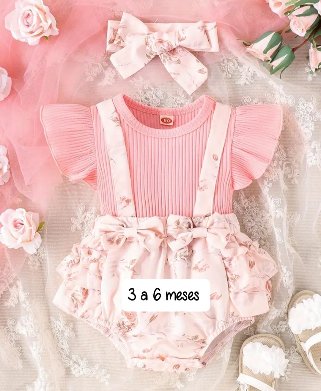 Rumper Rosado para niña de 3 a 6 meses con detalles de flores incluye su vincha